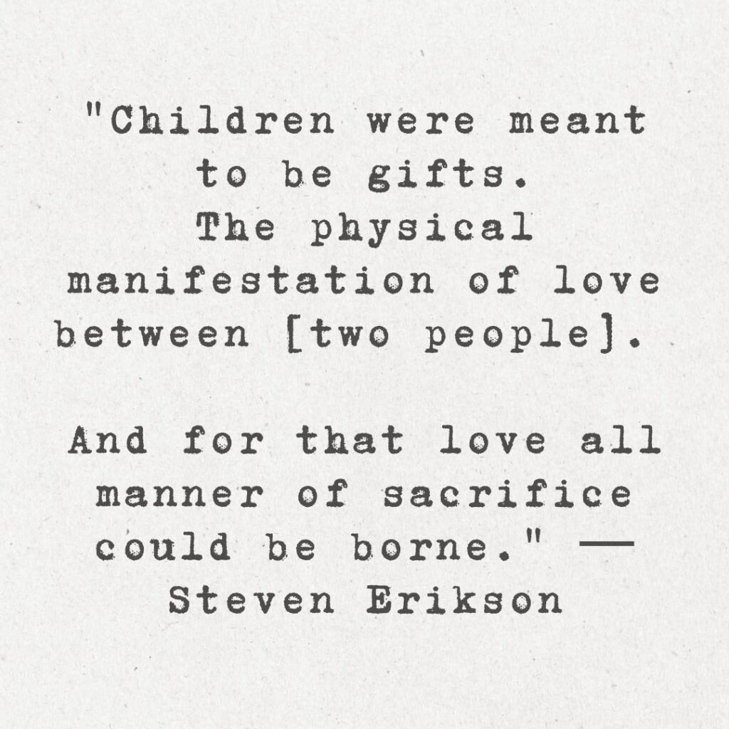 13. “Children were meant to be gifts. The physical manifestation of love between [two people]. And for that love all manner of sacrifice could be borne.” ― Steven Erikson